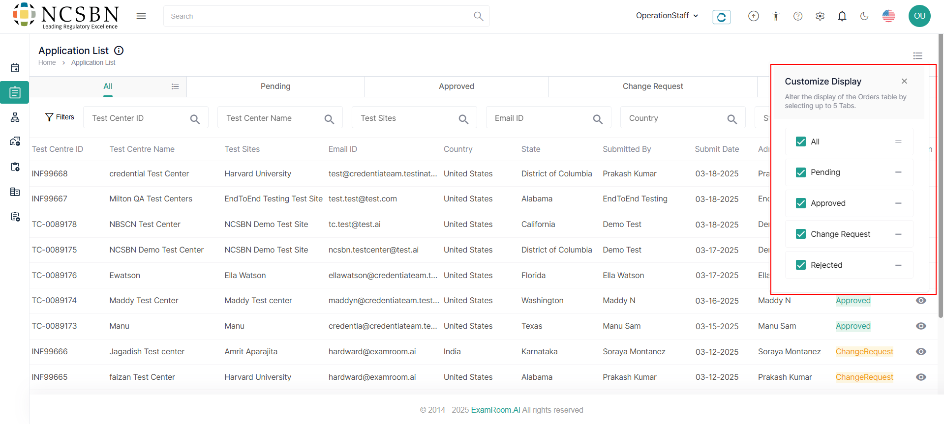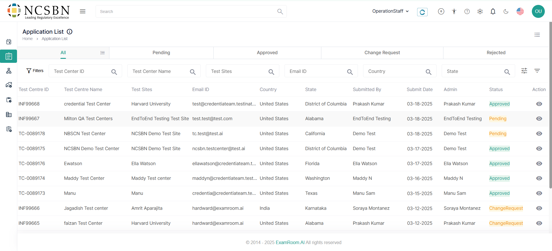 - Search the Applications using the Filter options based on Test Center ID, Test Center Name, Test Sites, Email ID, and Country.