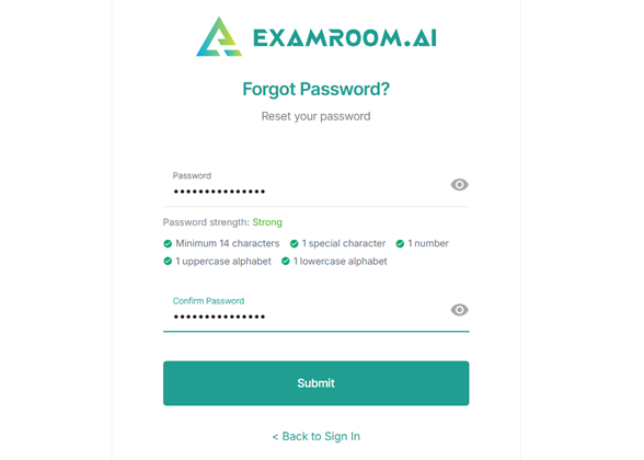 ) icon to view your new password. Click Submit to update the password. Click Back to Sign in to exit the reset password page.