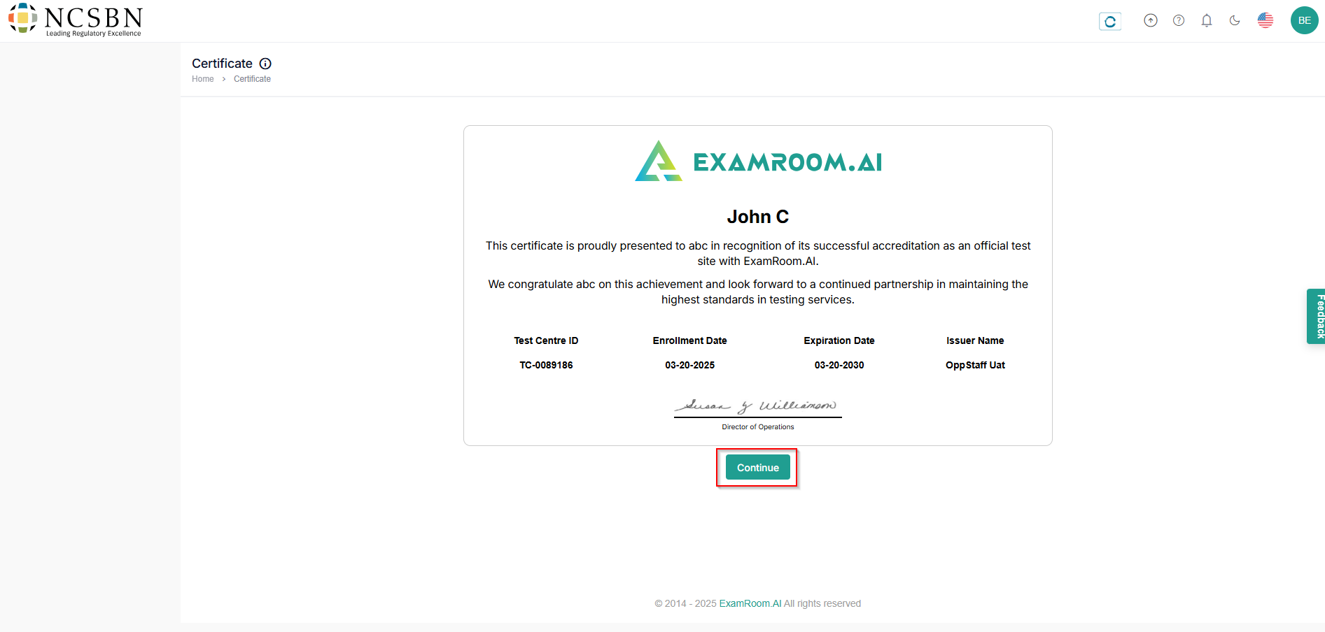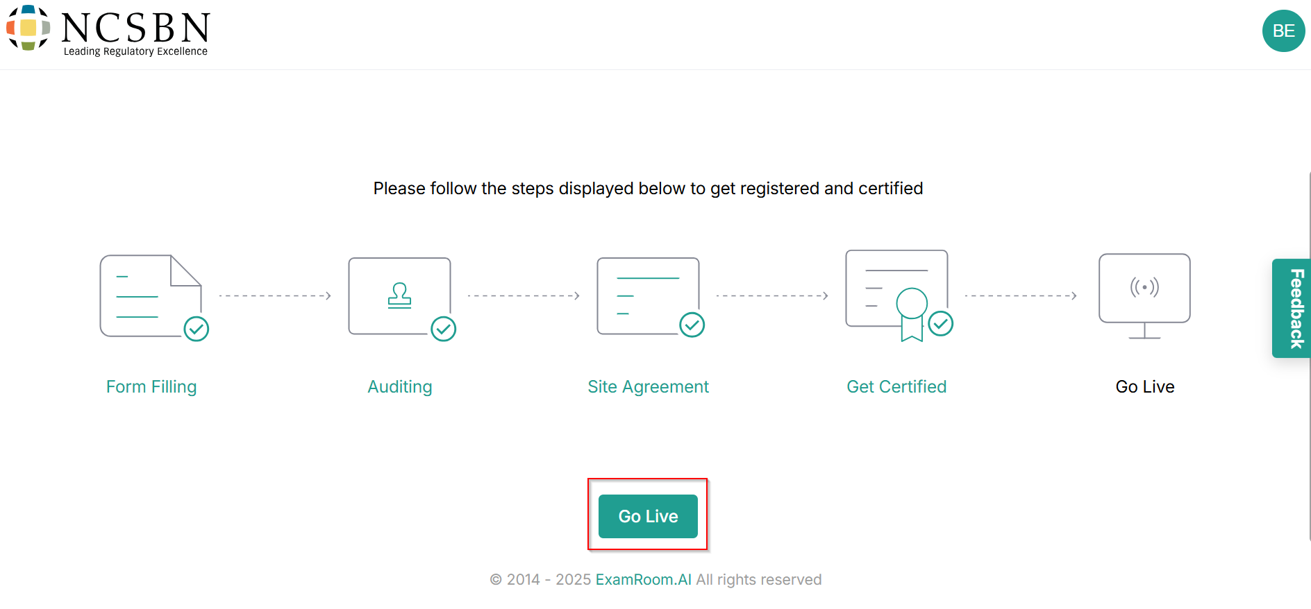 - Post certificate generation, click Go Live to allow the test center to run operations.
