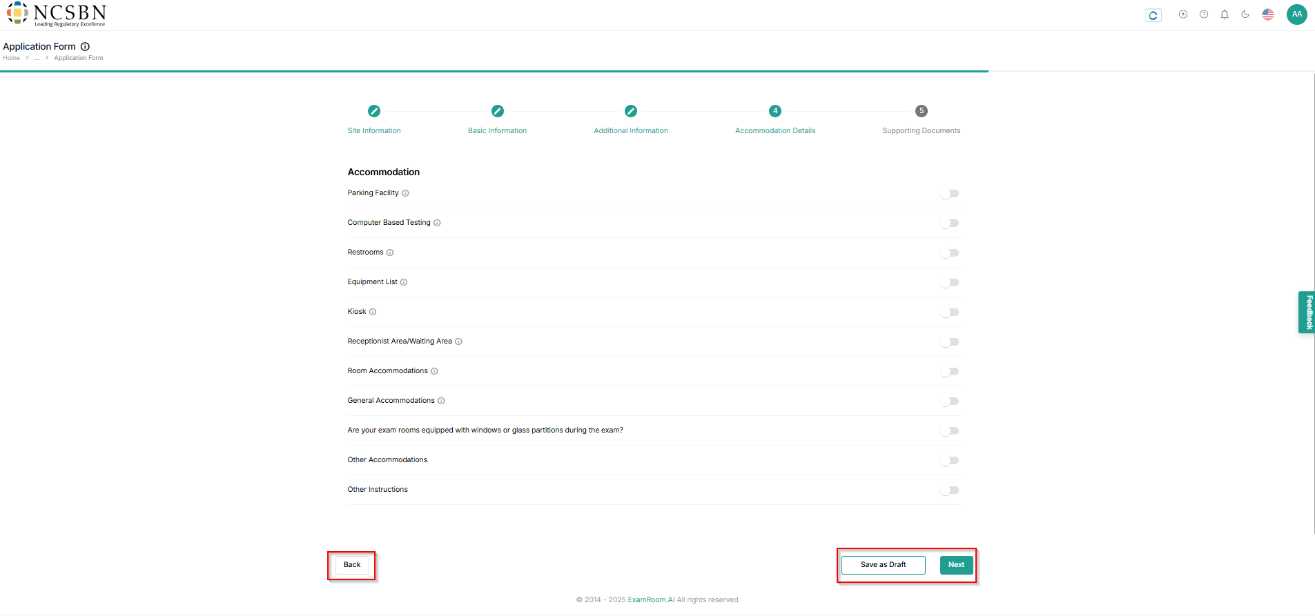 - After filling in all the details, click Next to proceed to Additional Information, Save as Draft to save the details, and Back to go back to site information.