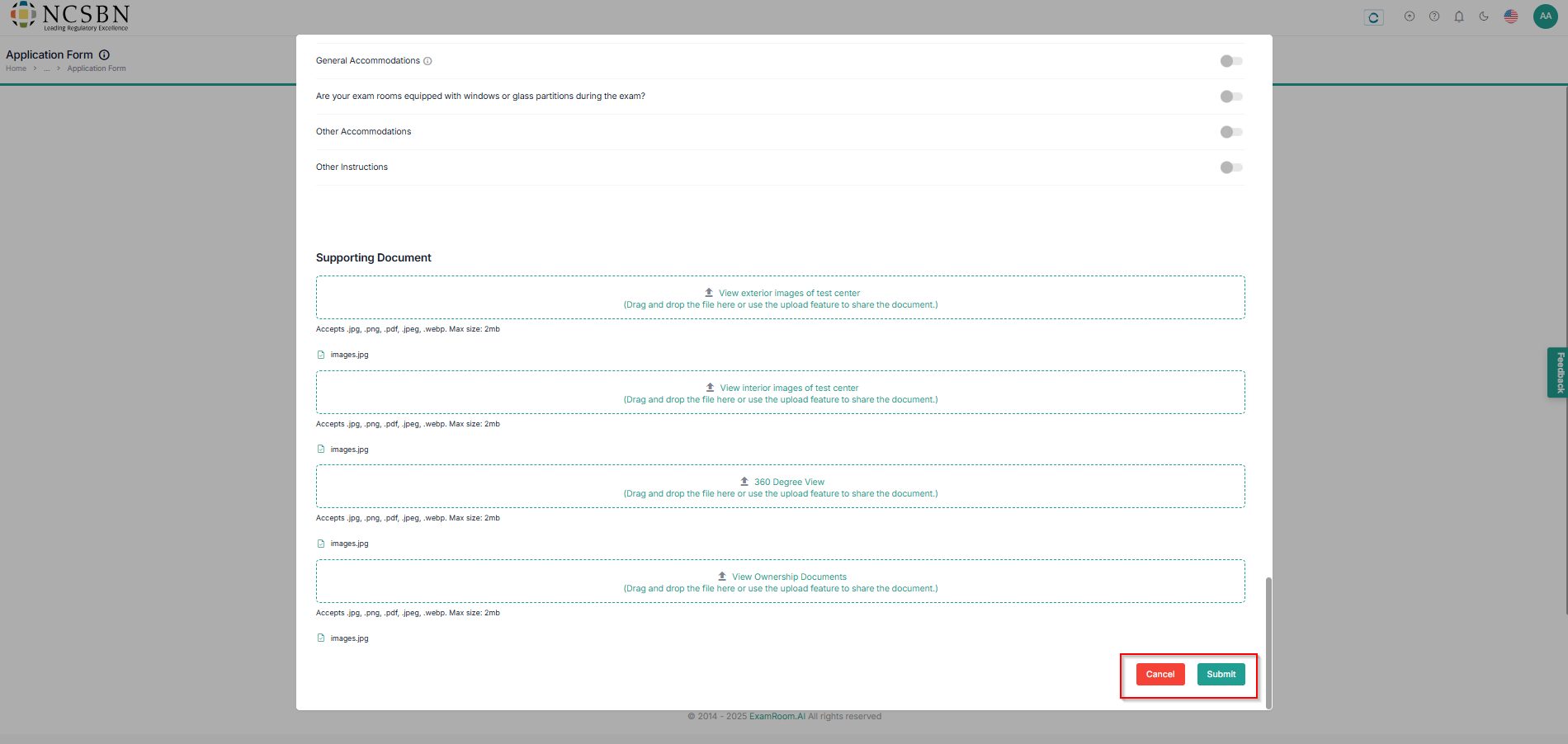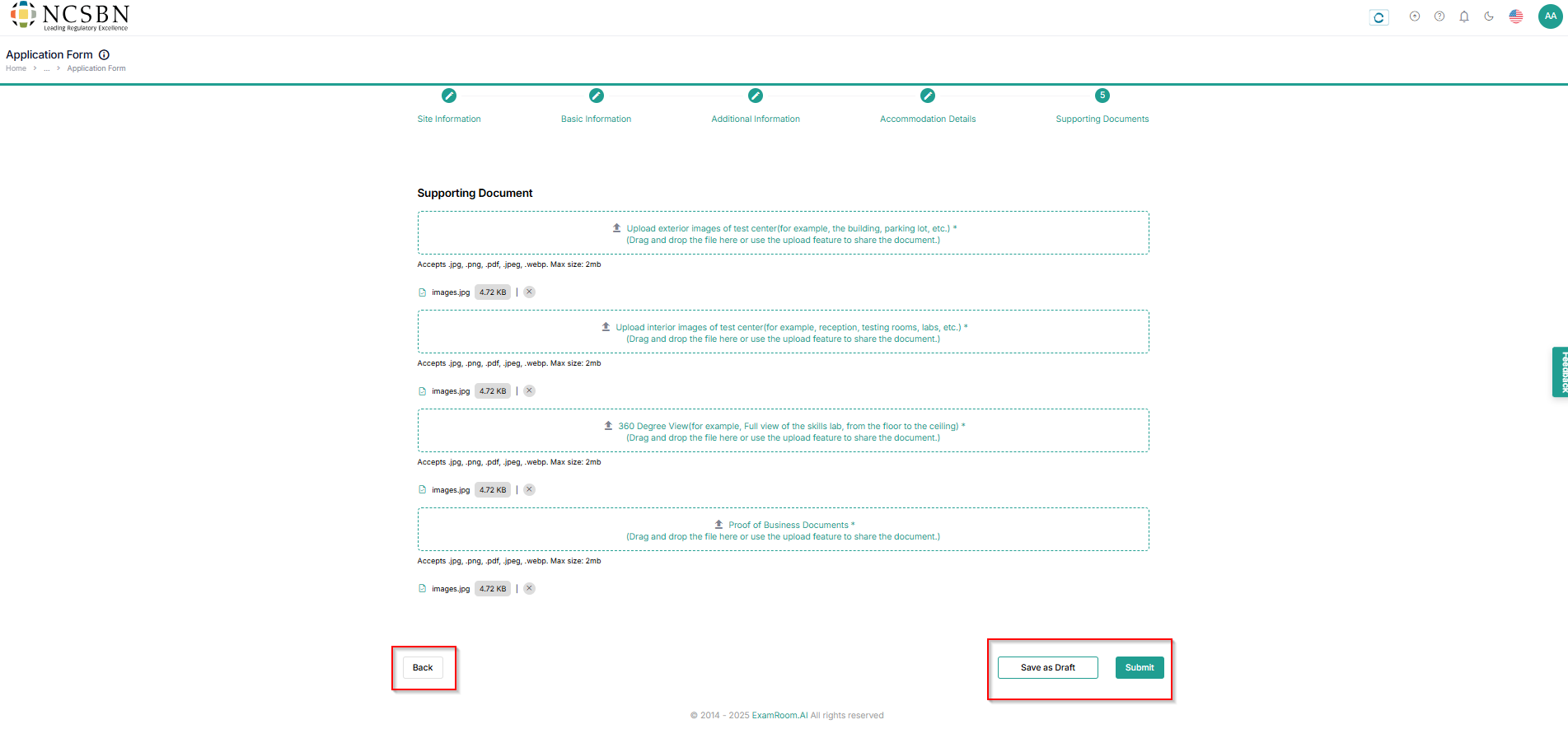 - In the Supporting Documents, Upload all the mandatory fields like Exterior Images, Interior Images, 360 Degree View, and Business Proof documents of the test center.
