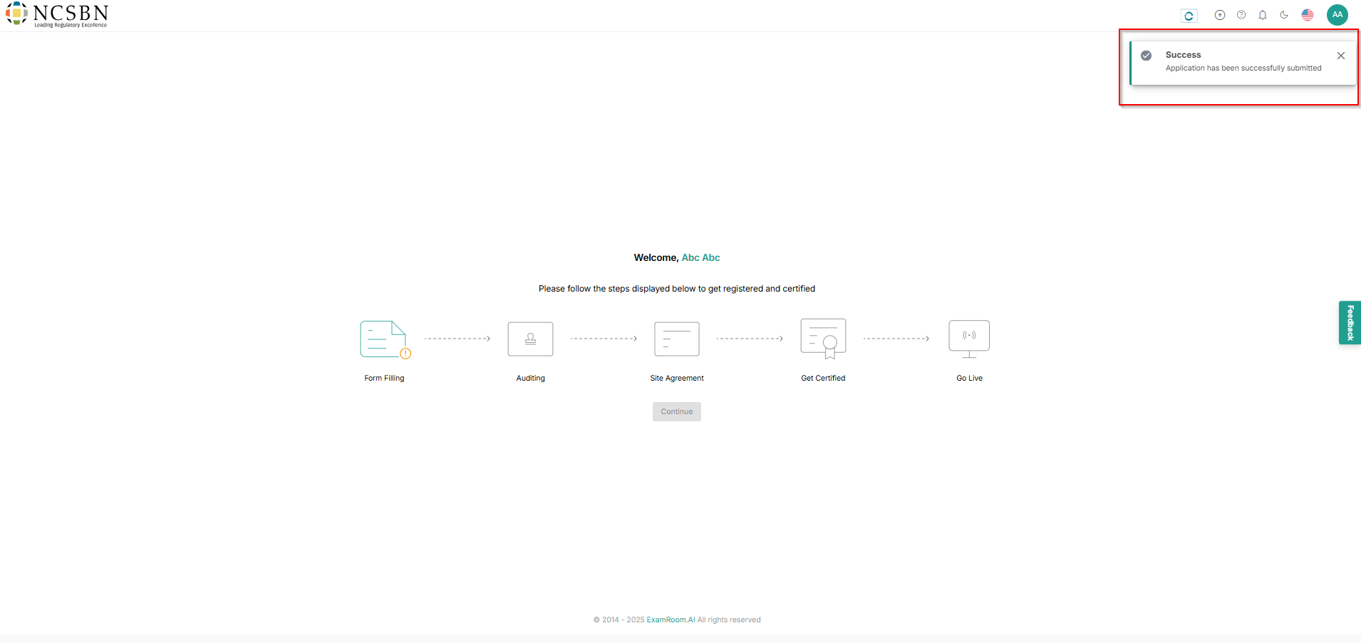 - After submission, you will receive a toaster message stating that the Application has been successfully submitted and sent for review.
