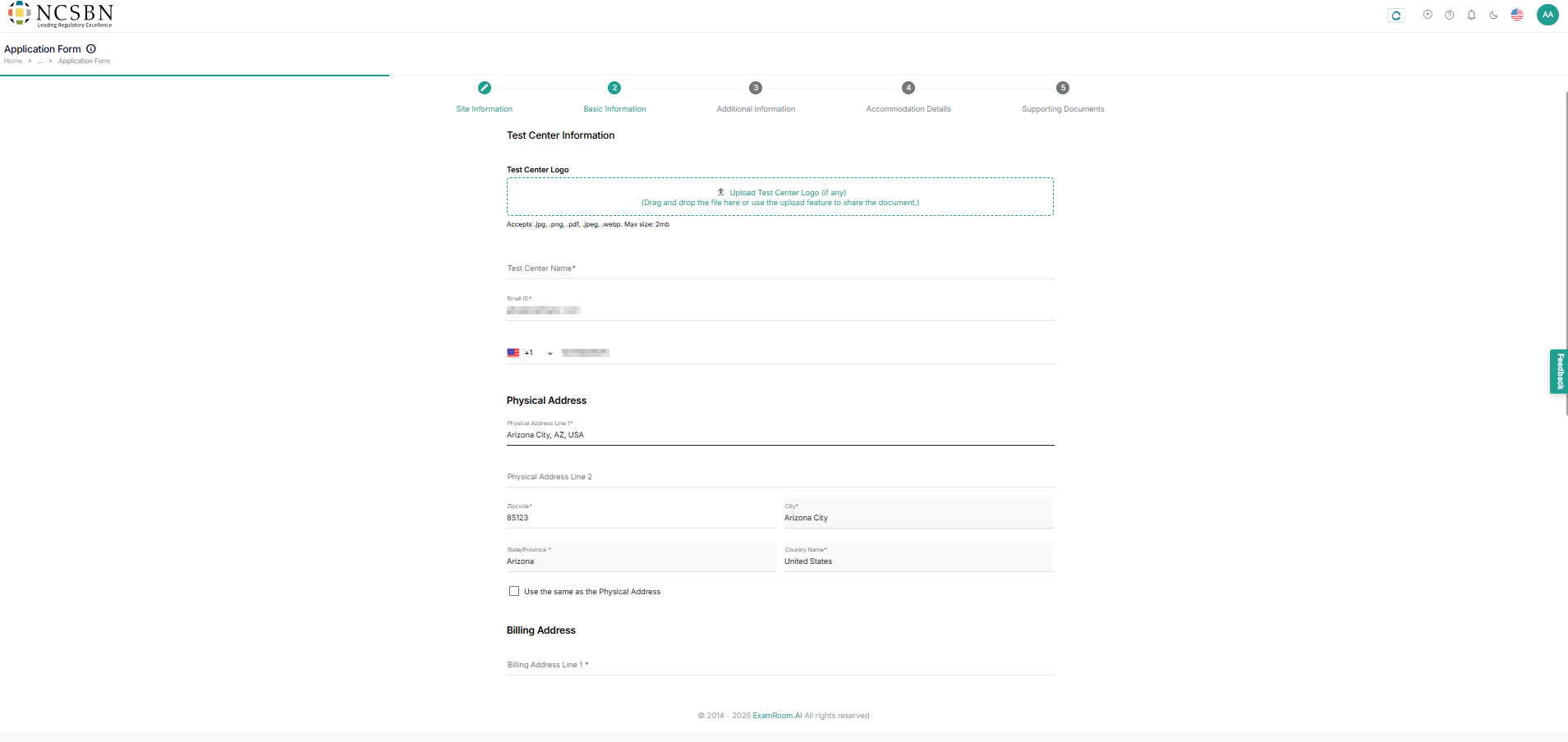 - Fill out the mandatory fields like the test center name and choose the billing address as per convenience.