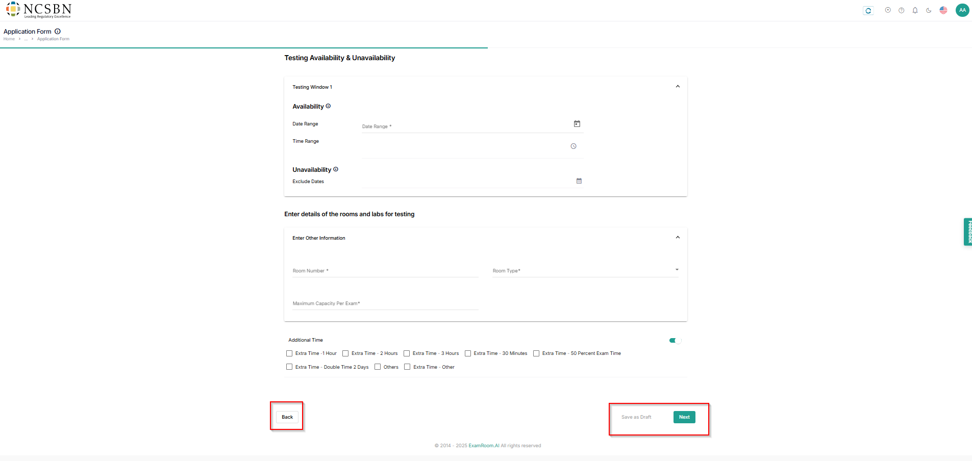- In the Enter details of the rooms and labs for testing, fill out the room details and choose any additional time if applicable.