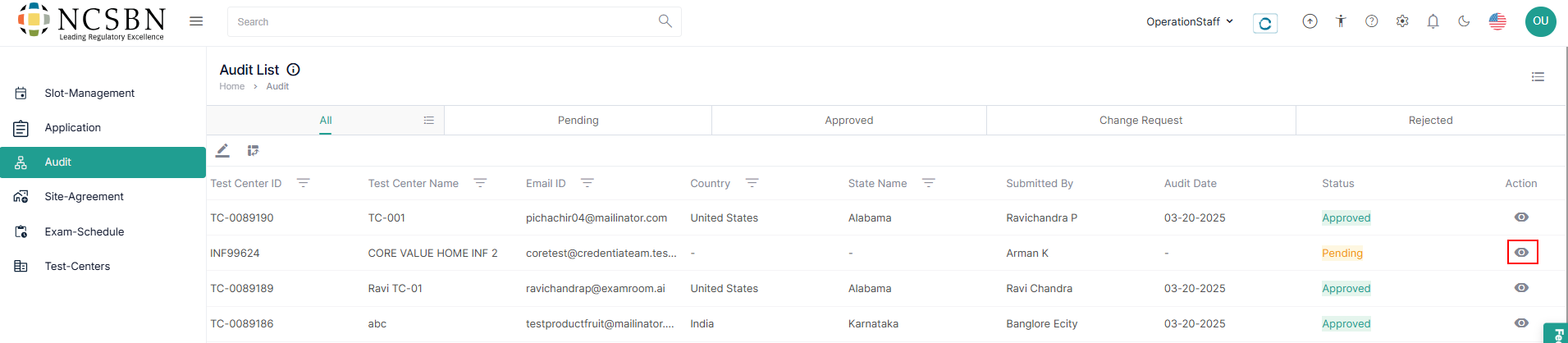 - Select an audit form with a pending status from the audit list to review. Under the Action column, click on the View icon to proceed to the audit form.