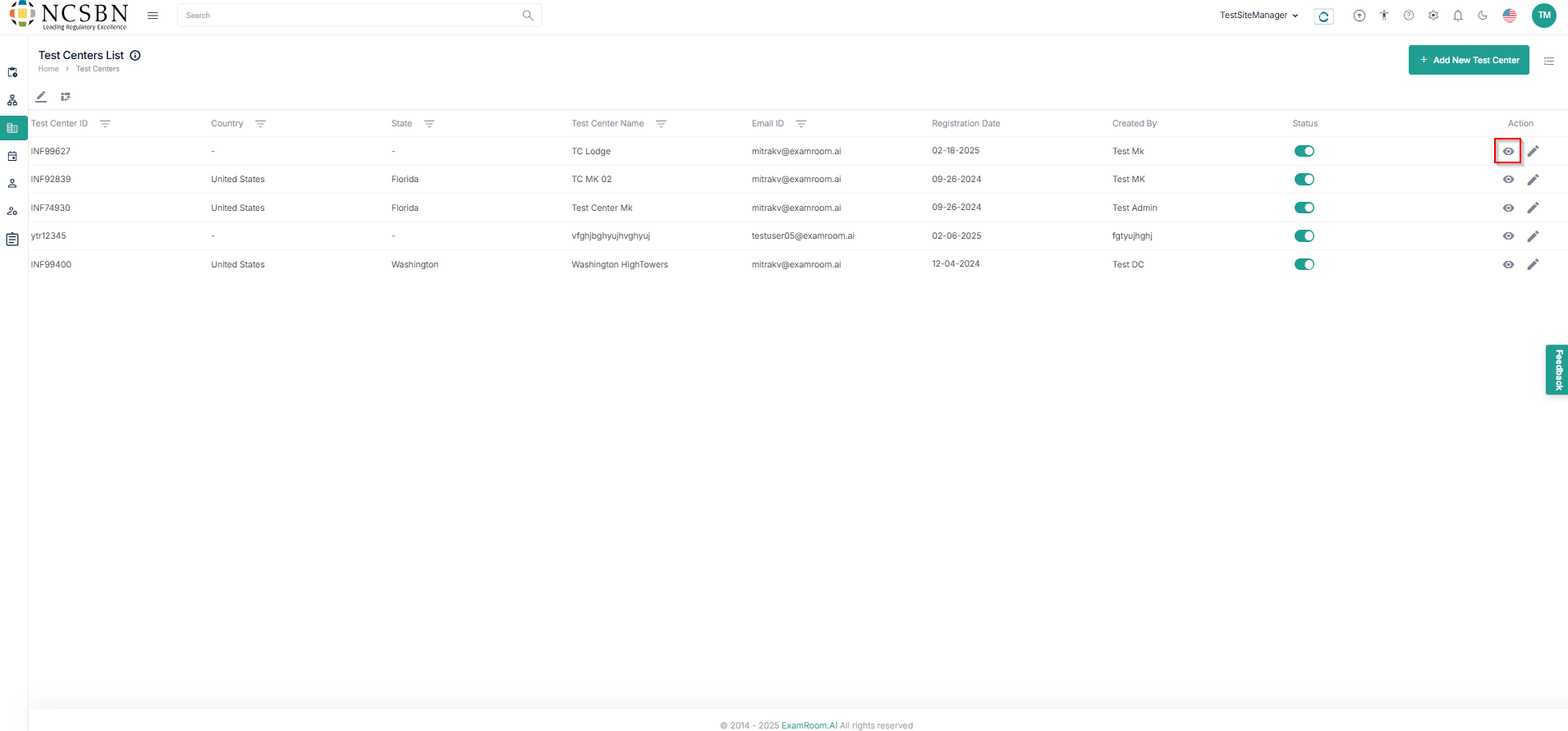 ) icon under the action tab to view the in-depth details of the test center.