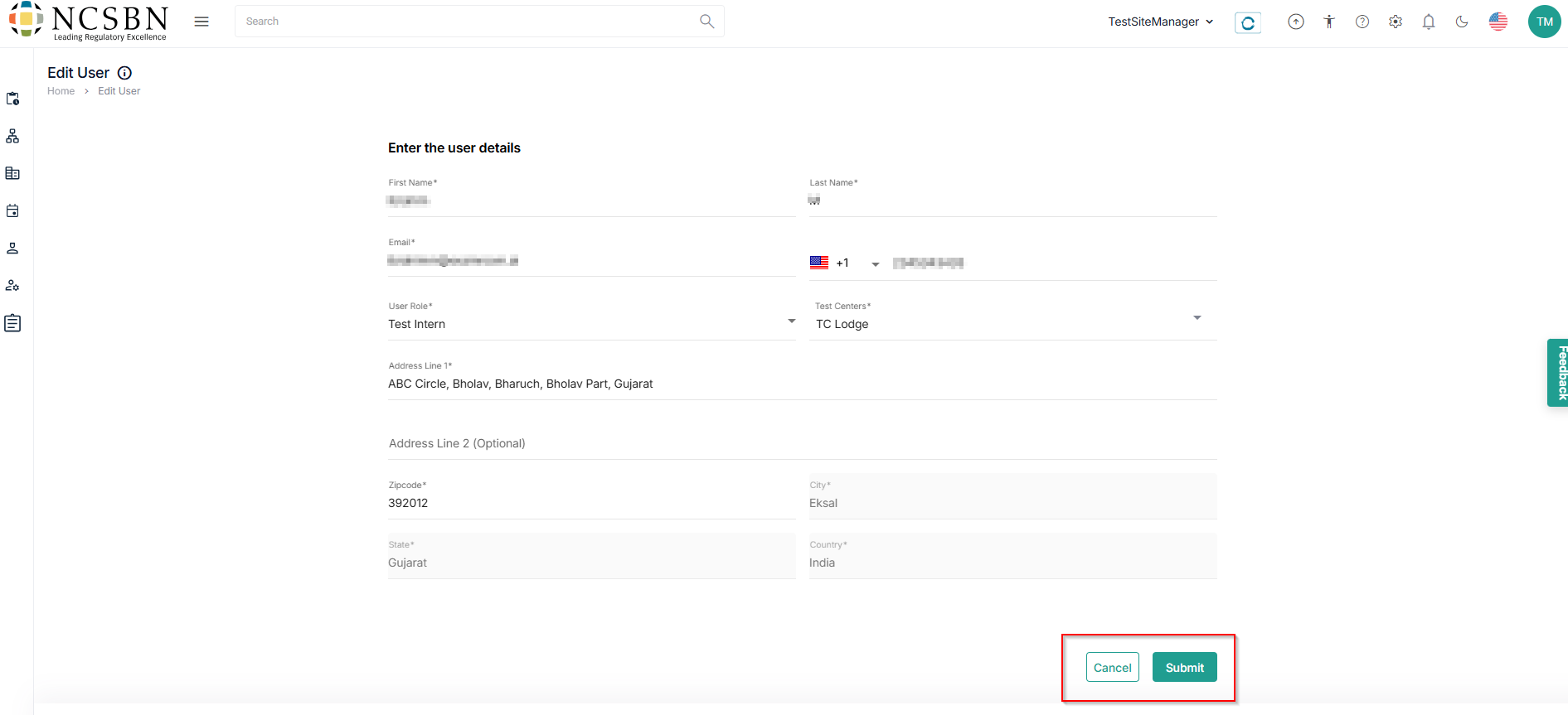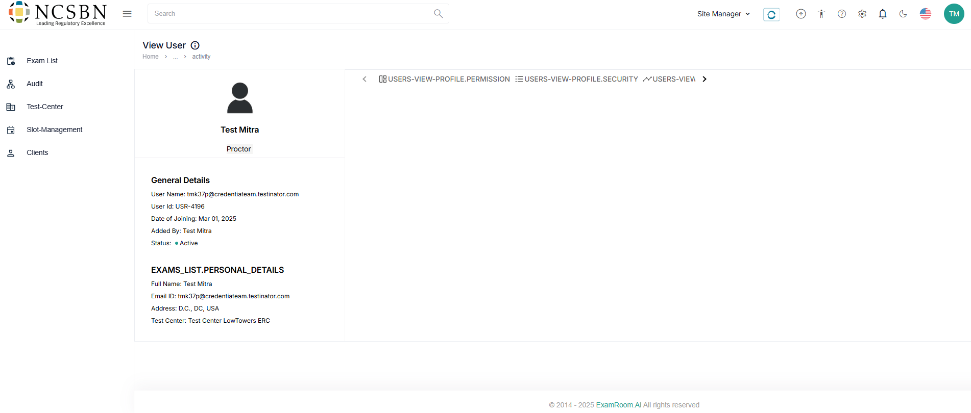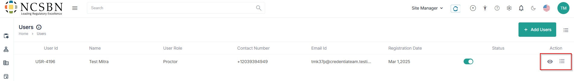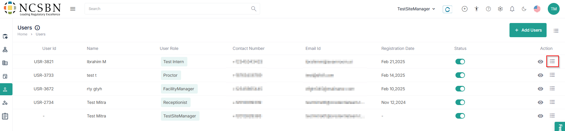The Site Manager can manage all the user details associated with the test site under the action tab.