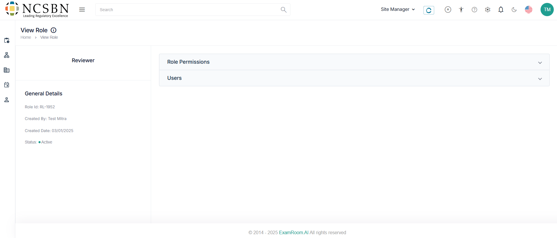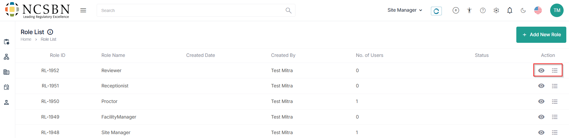 The Site Manager can manage all the user roles associated with the test site under the action tab.